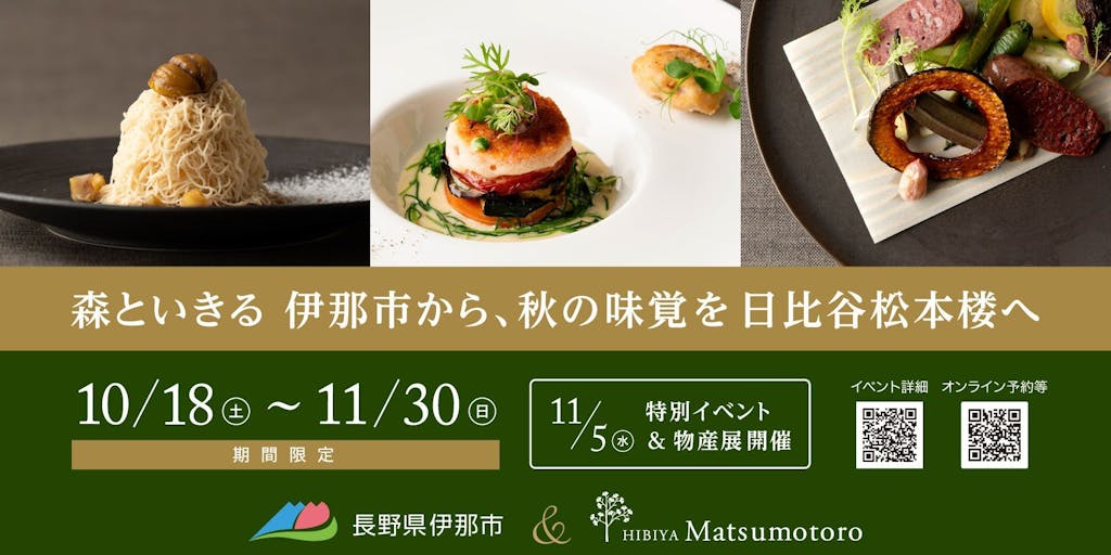 2025/11/193000m級の南アルプスと中央アルプスに抱かれた森と人がともに生きるまち。 アルプスの雪解け水と肥沃な大地で育まれた農産物は、秋の伊那市を彩り、郷の風情を美しく奏でます。伊那市と120年の歴史を紡ぐ「日比谷松本楼」で、伊那の風土や作り手に想いを馳せ、自然の恵みをふんだんに使った旬の食材を贅沢に味わう至福のひとときをお楽しみください。