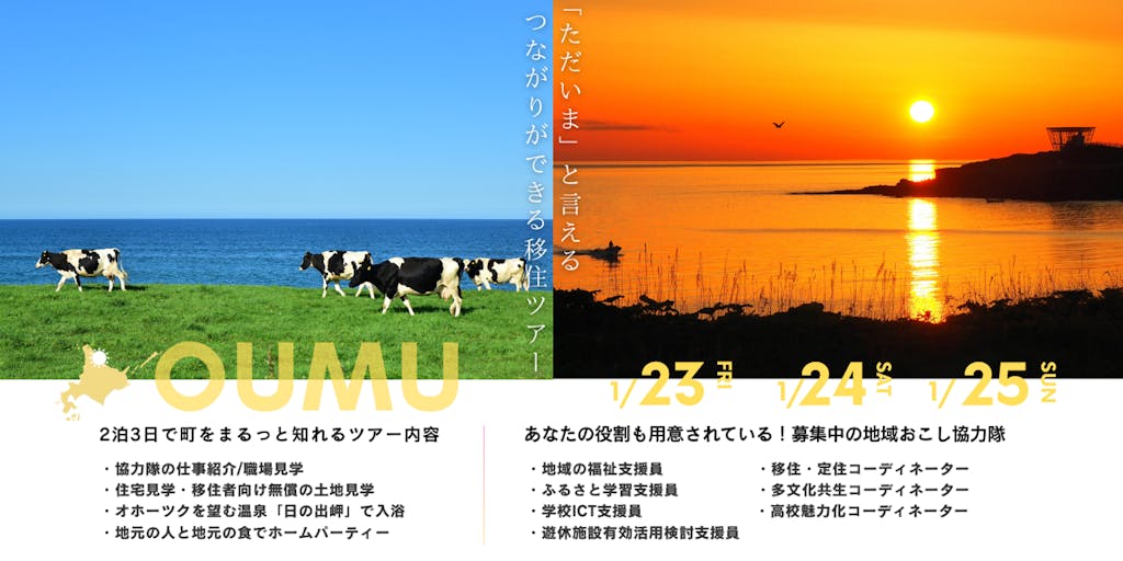 2026/01/09オホーツク海沿岸のまち・北海道雄武町で、地域おこし協力隊の7ミッションの募集が始まります。この2泊3日のツアーでは、協力隊の仕事紹介を中心に、町をまるっと巡りながら、ここで暮らす少し先の未来を思い描ける時間をお届けします。