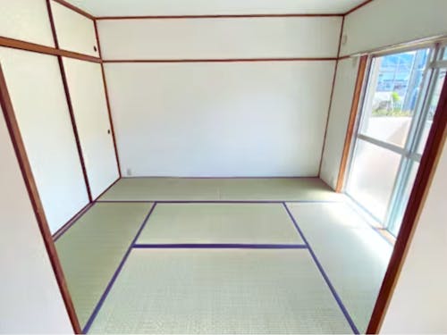 3DKタイプの間取りで、和室と洋室がそれぞれ独立しているため、家族でも一人暮らしでも使いやすい造りになっています。 大きな窓からは日差しがたっぷり入り、晴れた日は室内が自然光で明るく満たされます。 畳の部屋は落ち着いた雰囲気で、寝室や来客用の部屋としても使いやすく、家具の配置もしやすい広さです。 一方の洋室はフローリングでライフスタイルに合わせて自由に使えます。