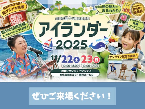 2025/11/19日本全国170以上の離島が一堂に会する“島の祭典”「アイランダー」。 今年2025年も、11月22日・23日の2日間にわたり、開催されます。 アイランダー2025について詳しくはこちら スマウト「新上五島町アイランダー」の記事 ▶︎https://smout.jp/plans/25474