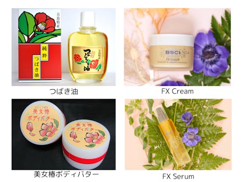 【FX Cream】 藻類由来の極めて貴重な天然成分「フコキサンチン」と五島産「椿油」を配合した基礎化粧品。五島産椿油にシアバターやスクワランなど、保湿力の高い成分を配合しました。さらに、オランダビユ種子エキス、ツボクサエキス、長崎県産のビワ葉エキスやイチゴ果実エキスなどが肌荒れを防ぎ、エイジングケアに寄り添います。