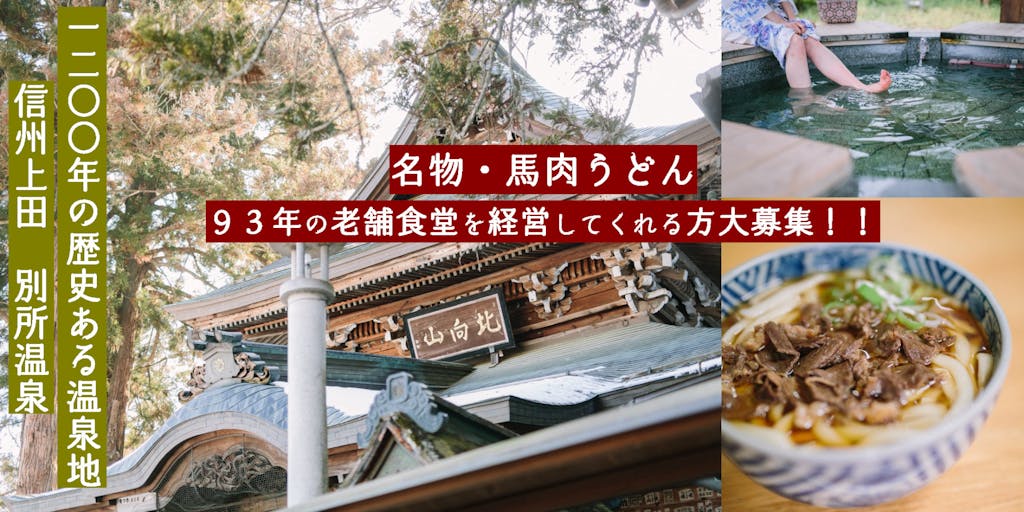 ・別所温泉に移住して、地域と共に生きていける方 ・食堂の運営に興味がある方(飲食経験はあれば嬉しい) ・古いものを大切にしつつ、新しい風も入れられる方 ・地域の行事や交流に参加できる方 ・“商売”より“人”が好きなタイプの方 ・連携元の上松やからの意見にも柔軟に対応してくれる方 観光地でありながら、静かで穏やかな温泉地。 人の温かさがある分、しっかり向き合ってくれる人が向いています。