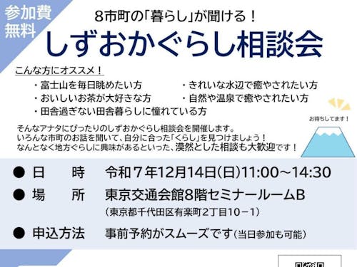 2025/11/23静岡県主催で、県内8市町が集まる「しずおか暮らし相談会」が開催されます。 静岡への移住に興味がある方、田舎暮らしに憧れている方などにおすすめです♪ どなたでもお気軽にご参加ください。皆様のお越しをお待ちしています。
