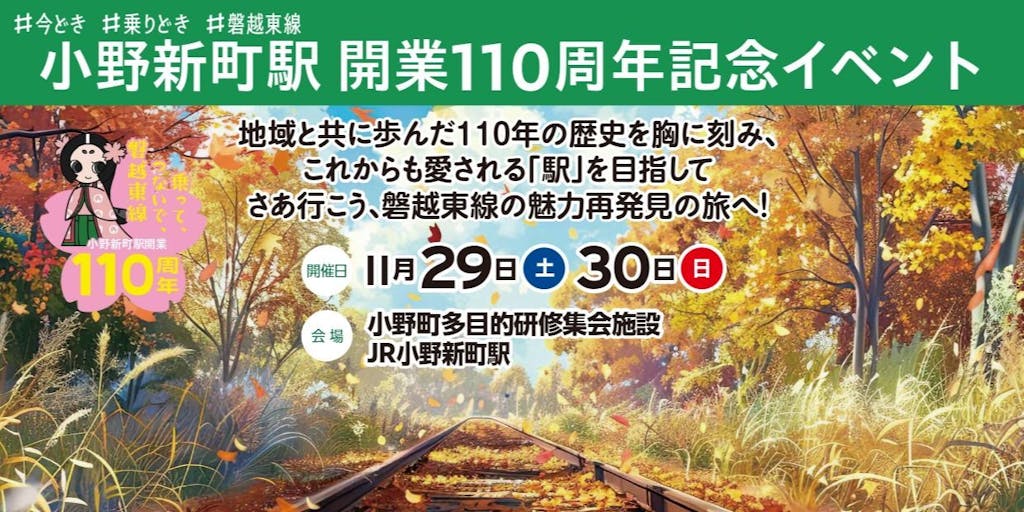 開業110周年を記念し、「小野新町駅開業110周年記念イベント」、福島県事業「ふくしま鉄道博」を令和7年11月29日(土)・30日(日)の2日間、小野町多目的研修施設で同時開催!!
