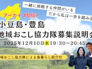 【プログラム】 日時:12月10日(水)19:30~20:45 内容(予定): 【第一部】小豆島・豊島 移住の手引き ・小豆島・豊島の概要 【第二部】現地域おこし協力隊に聞く!私の島暮らし紹介 ・移住×地域おこし協力隊である私の島暮らし ・地域おこし協力隊として働く魅力 【第三部】各分野担当者による活動紹介 【第四部】グループに分かれて合同相談会