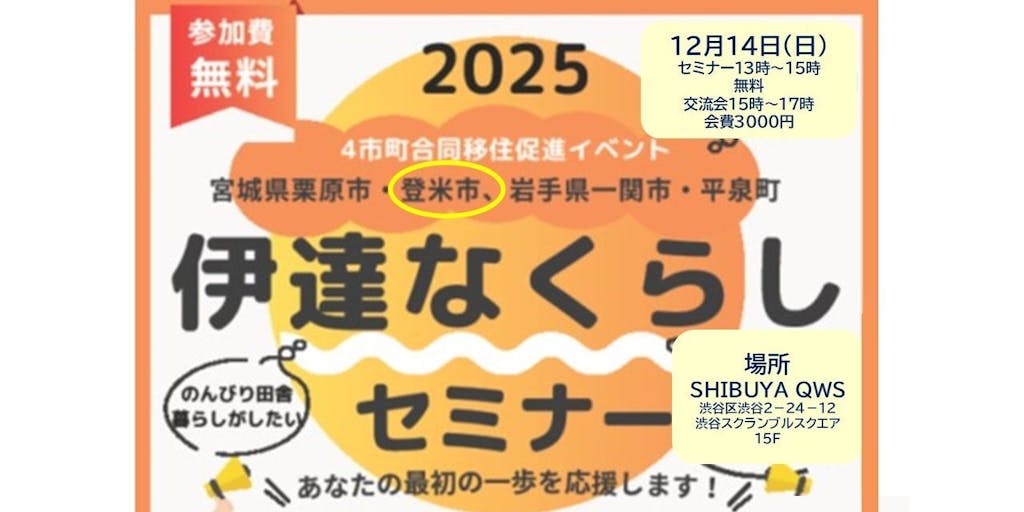 2025/12/02「栗登一平」この人の名前のような呼び方は、宮城県北部の栗原市・登米市と岩手県南部の一関市・平泉町が県をまたがって、合同で開催している移住促進イベントです。