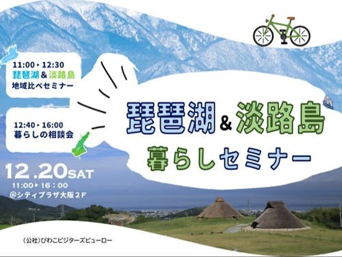 【日時】令和7年12月20日(土)11:00~16:00 11:00~12:30 琵琶湖&淡路島地域比べセミナー:滋賀県&兵庫県地域くらべトーク 12:40~16:00 暮らしの相談会:個別相談会