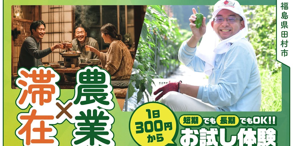 ■参加費 体験にかかる費用は発生しませんが、下記についての費用は実費負担となります。 ・体験期間における宿泊費、食費、移動費等の実費負担 ・田村市までの交通費についても実費負担 ※宿泊、移動については、負担軽減のための制度がありますのでご相談ください。
