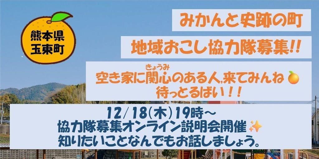 2025/12/10こんにちは。一社)くまもと地域おこし協力隊ネットワークです。県北の玉東町で空き家の利活用・移住定住促進に取り組む地域おこし協力隊を募集します!