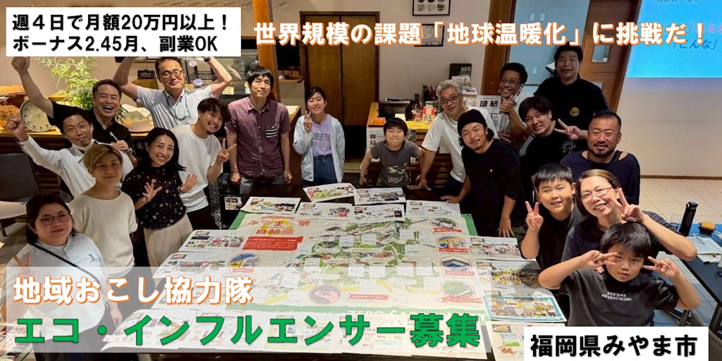 2026/01/23みやま市は、博多駅から新幹線で25分ほどの距離にある、有明海の干拓地にのどかな田園地帯がひろがる農業中心のまちです。 この町は、全国初の自治体新電力会社を設立し、エネルギーの地産地消を実現していたり、生ごみを分別し、電気と肥料を作る「バイオマスセンター」を稼働し、焼却ごみ量50%削減を達成しています。これらはグッドデザイン賞受賞や環境省や農林水産省からも表彰され、全国、海外からも視察者が訪れる環境先進都市となっています。 しかし、PRが不得手でこのポテンシャルを十分に生かし切れていない部分があります。 あなたのミッションは、「エコ・インフルエンサー」として、市内外にこの取組をPRすることです! みやま市の環境を市外にPRしたり、市民の皆さんに引き続きごみ分別などエコ活動に協力していただけるように、