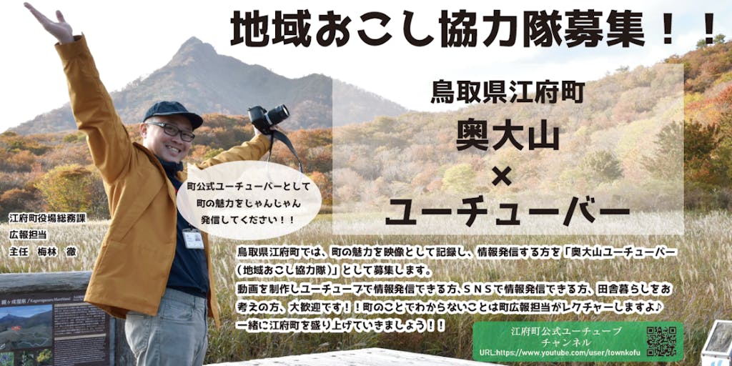 鳥取県江府町(こうふちょう)は、中国地方で最も高い山、大山(だいせん)の麓にある水と自然の豊かなまち。 日本で一番人口の少ない鳥取県の中で、一番人口の少ない自治体が「鳥取県江府町」です。 小さな町ですが、町には自然、伝統、教育活動など魅力的な資源がいくつもあります。 このたび、町の魅力をもっと伝えていき、地域活性化を推進していくために、町公式ユーチューバー「奥大山ユーチューバー」(地域おこし協力隊)を募集します。 地域の魅力をあなたの持つスキルを活かして江府町の名前を全国に広めてみませんか? 町のことでわからないことは町広報担当がしっかりとレクチャーいたしますので、何なりと聞いてください!! みなさまからのご応募をお待ちしています!!