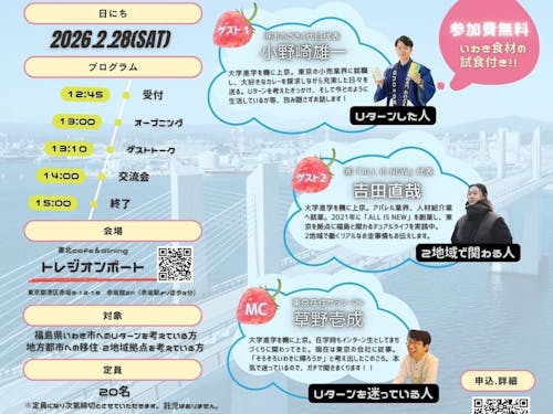 【対象】 福島県いわき市へのUターンを考えている方 地方都市への移住・2地域居住を考えている方 ※お子様の参加もOKですが、託児はありません