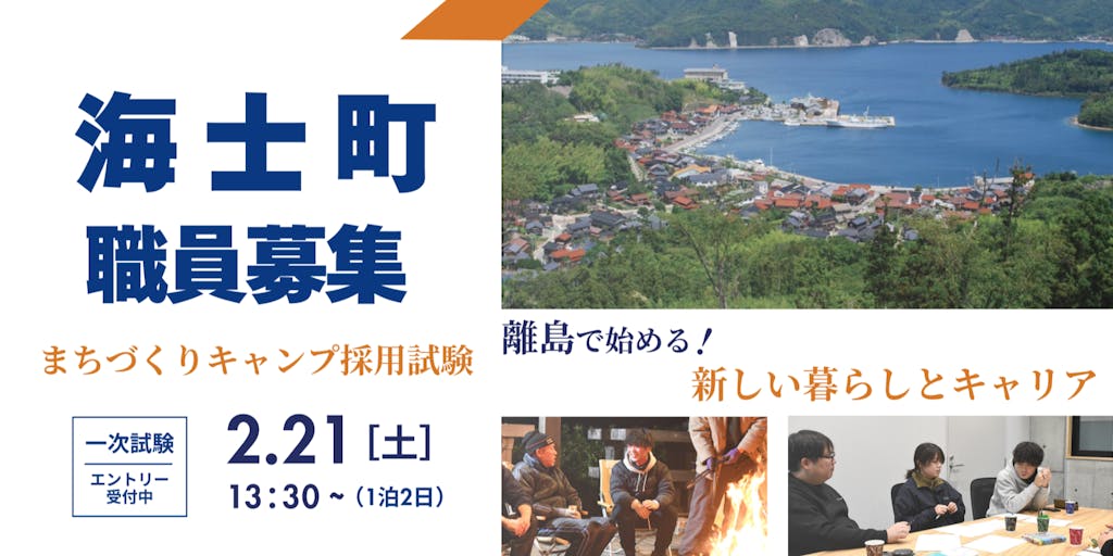 2026/02/12海士町役場(島根県隠岐郡)では、令和7年度 海士町役場 正規職員採用試験「まちづくりキャンプ採用枠」の募集を開始しています。 この採用は、海士町役場の正規職員(一般行政職)の採用を目的としたもので、1次試験では1泊2日の野外キャンプとSPI試験を組み合わせたキャンプ型の選考を実施します。