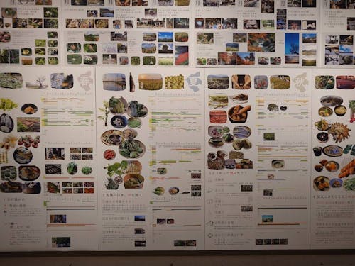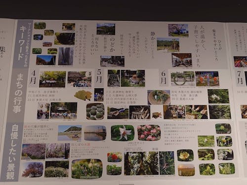「ワークショップで集まったキーワード」「まちの行事」「自慢したい景観」「まちの農作物と食文化」などを、12ヶ月の暦の順に並べて、写真や言葉を、高さ3m幅7m壁面にびっしり情報を書き出してみました。 その季節の農作物から、行事の食、郷土料理が見えてきて、まちの風景、景観まで見えてくる面白い図が出来上がりつつあります。このなかの、さらに足りない「かけら」を付箋で追加してつなげて、年度末にはフェノロジーカレンダーを仕上げたいと考えています。