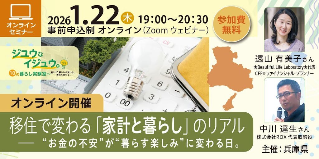 2026/01/081/22(木)にオンラインにて、兵庫県主催セミナー「移住で変わる「家計と暮らし」のリアル―"お金の不安"が"暮らす楽しみ"に変わる日。」を開催します!