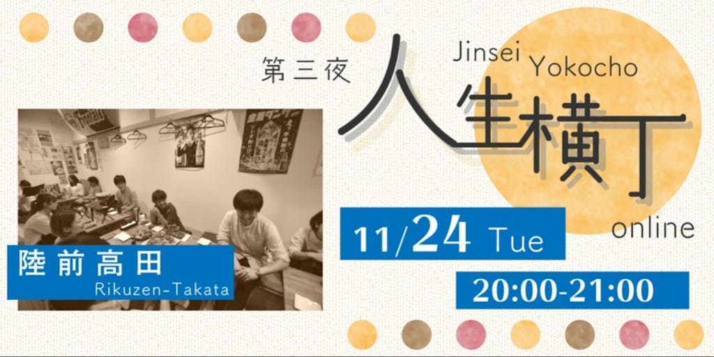 ・スケジュール: ■人生横丁 第三夜 日時:2020/11/24(火) 20:00~21:00 開催方法:Zoom( 登録不要でご覧いただける通話アプリです ) 参加費:無料 主催:特定非営利活動法人高田暮舎(https://takatakurashi.jp/) お申し込み:「興味ある」ボタンを押してください。詳細をご連絡いたします!