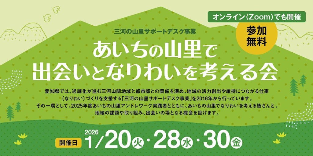 2026/01/21あいちの山里※でなりわいを行う人たちと、地域の魅力や課題を知り出会いの場となるイベントを、地域別に3回開催します。全て参加無料・オンライン(Zoom)でも実施します。この機会に是非、ご参加ください。 ※岡崎市(額田地区)、豊田市(旭、足助、稲武、小原、下山、藤岡の各地区)、新城市、設楽町、東栄町、豊根村の6つの市町村からなる地域