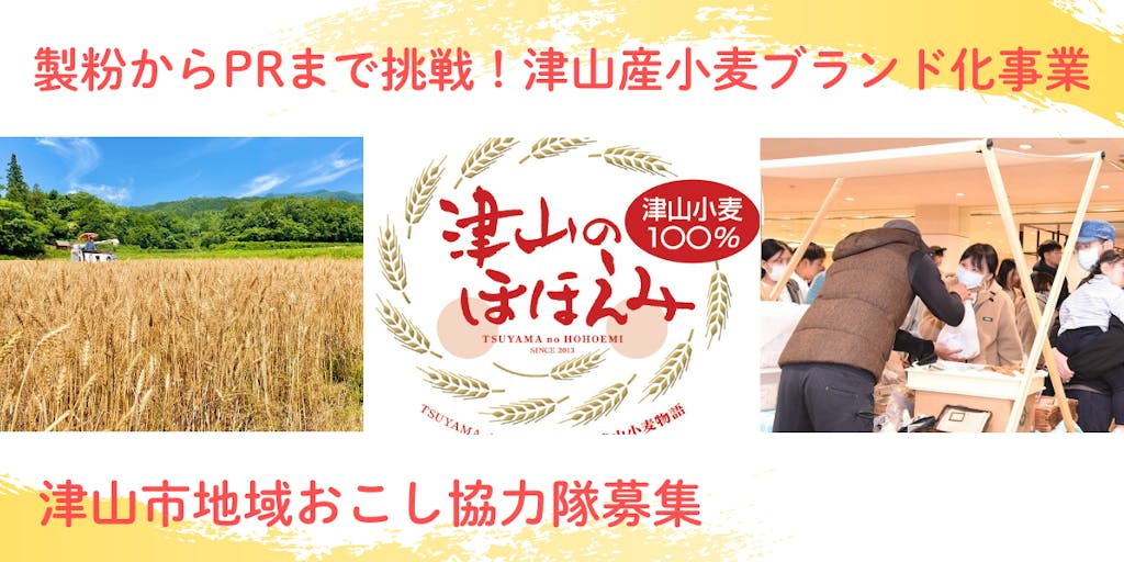 津山市では小麦の産地化に取り組んでおり、小麦生産者、JA、行政、菓子店等が一体となり津山産小麦の地域ブランド化を目指しています。津山産小麦100%の小麦粉「津山のほほえみ」は、市内外の菓子店、パン店などで使用されています。地域おこし協力隊の受入を通して、津山小麦の魅力をより多くの人に知ってもらうことで、津山産小麦のブランド化促進を目指しています。