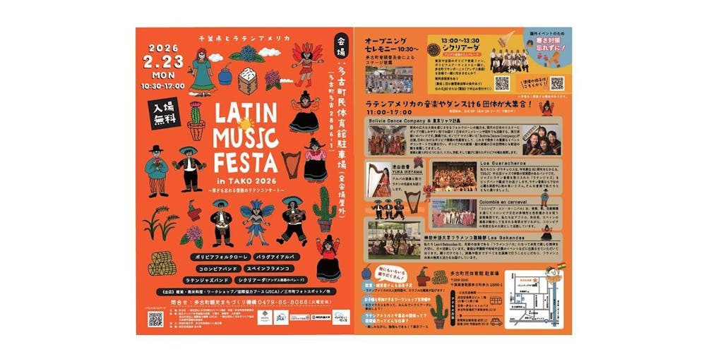 2026/01/28『LATIN MUSIC FESTA in TAKO 2026』を2026年2月23日(月曜日)に開催します! 多古町に移住してきた地域おこし協力隊の発案によって始まったこのイベントも、今年で4回目を迎えます。 今回は完全屋外開催! 多古町、そしてラテンアメリカの雰囲気を感じながら、寒さも忘れる情熱のコンサートをお楽しみください!