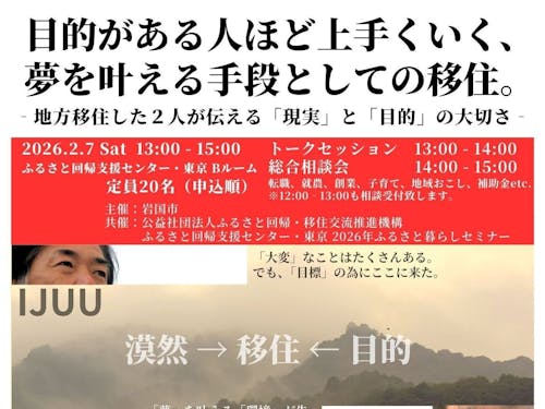2026年2月7日(土)13:00~15:00 場所:東京交通会館8F Bルーム (ふるさと回帰支援センター・東京) 13:00ー14:00 トークセッション 14:00ー15:00 相談会 (転職、創業、就農、子育て、地域おこし、補助金etc...) ※12:00ー13:00の間も相談を受け付けています