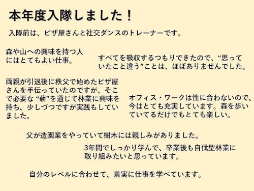 ・林業に興味がある ・山が好き ・自然に触れる仕事をしてみたい ・気の置けない仲間が欲しい ・精神的にもバランスのよい仕事がしたい ・秩父が好き
