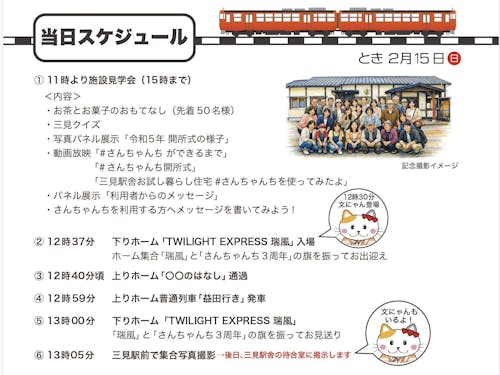令和8年3月は記念すべき開所3周年を迎えますが、このまたとない機会に、市民の方々はもとより、鉄道ファンや #さんちゃんち ファンを広くお招きして感謝イベントを開催したいと思います。ぜひあなたも一緒にお祝いしませんか?