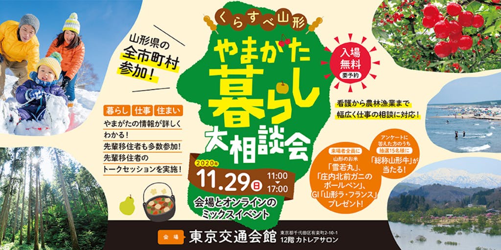 2020/11/29移住を考えるときに欠かせない『仕事』『住まい』『暮らし』についてまとめて相談できる、『やまがた暮らし大相談会』を今年も開催します。 当日は、県内全市町村をはじめ、看護から農林漁業、起業について『仕事』の相談ができる人材確保窓口や、空き家や宅地分譲、賃貸住宅等『住まい』の相談ができる宅建協会や不動産協会が出展します。 また、『暮らし』についての相談は、県内全市町村の移住担当者が対応!また、住宅ローンや教育資金などについても相談ができる金融機関など、一丸となってみなさまの移住相談に対応します! さらに、みなさんにもっと山形県を知っていただけるよう、来場した方には山形のお米「雪若丸」やGI「山形ラ・フランス」などをプレゼント。 11月29日(日)は、ぜひ東京交通会館12階カトレアサロンにお越しください!