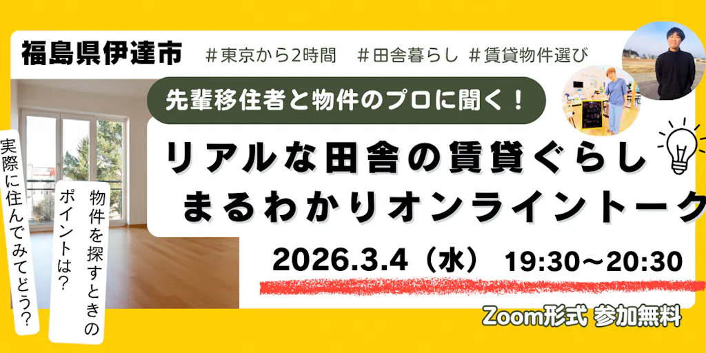 イベントでは、伊達市に移住して実際に賃貸暮らしをされている先輩移住者と物件のプロをゲストに迎え、“地方だからこそ”の賃貸物件探しのポイントや実際に暮らしてみての感想など、リアルな情報をお話しします。
