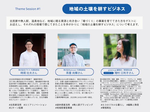Theme Talk Session 🔍#01 地域の土壌を耕すビジネス 時岡 壮太 さん(株式会社デキタ 代表取締役) 茶屋 尚輝さん(株式会社plower 代表取締役) ファシリテータ 増村 江利子さん(greenz.jp編集長/環境再生医)