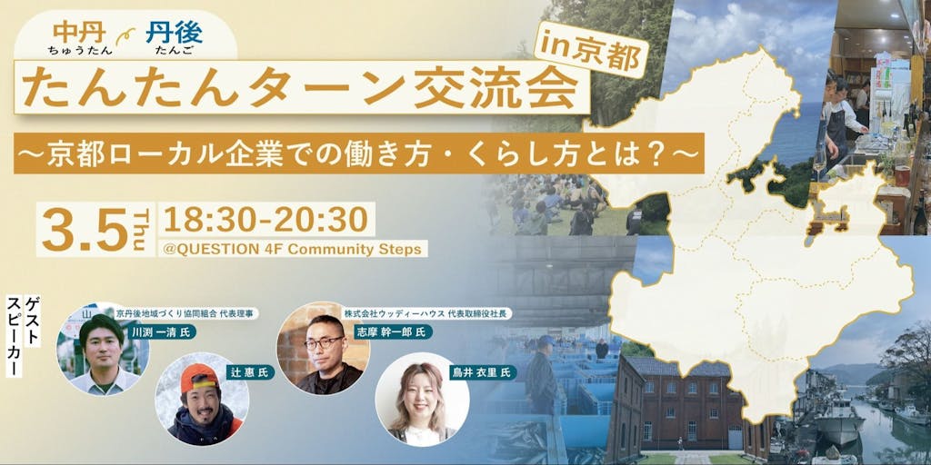 【たんたんターン交流会】では、京都府北部でユニークな活動や事業を行う企業の経営者と若手社員をゲストに迎え、それぞれの視点から京都北部のリアルと面白さを紐解きます。 🤔「地域だからこそできる働き方や暮らし方って、どんなの?」 🤔「京都北部の企業や地域のおもしろさって、なんだろう?」 彼らの活動や体験から、これからの働き方・暮らし方の手がかりを、参加者のみなさんと一緒に考え、学び、つながる、トーク&交流イベントです。