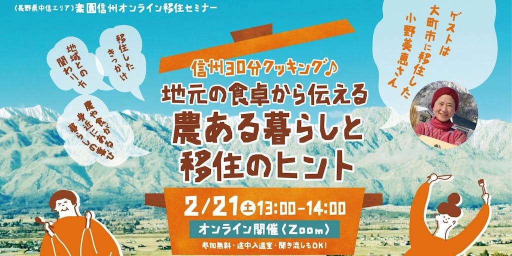 2026/02/06池田町に移住され、現在「信州移住コネクター」として活動中の田中さんファシリテートのもと、大町市に移住された小田さんをゲストに迎え、農ある暮らしと移住のヒントをお伝えするオンラインセミナーです。