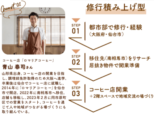 ■ゲスト紹介 コーヒー店「ロマリアコーヒー」 青山 春司さん(南相馬市) 山形県出身。コーヒー店の開業を目指し、調理師免許取得のため大阪へ進学。 卒業後は仙台でコーヒー店に就職し、2014年に「ロマリアコーヒー」を仙台市で開店。 2022年に南相馬市へ移住。店舗も移転し、2023年2月に同市原町区での営業をスタート。 コーヒーを通じて人や地域がつながる場づくりにも取り組んでいる。
