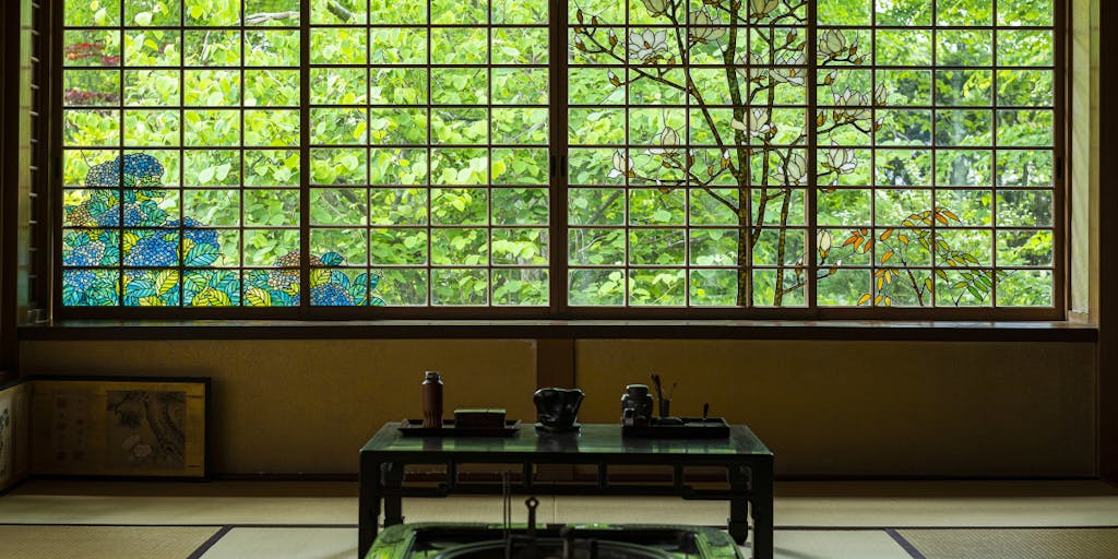 なかでも離れ「詩夢庵」を装飾するステンドグラス作品は、日本におけるステンドグラスの先駆者である小川三知(おがわさんち)によって制作され、彼の最高傑作であると位置づけられています。