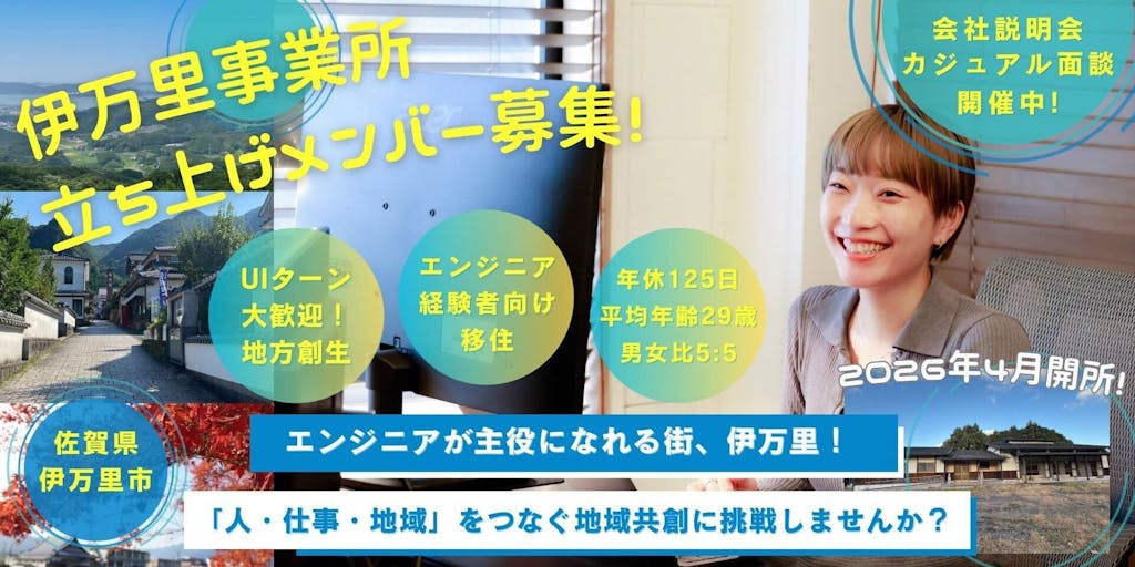 📍お任せしたいのは、「開発」だけではありません。 今までのエンジニアのご経験を存分に活かし、切磋琢磨しながら、地域の未来にもダイレクトに貢献する。そんな手応えを肌で感じられる環境です。開発に集中できる環境で、伊万里やエンジニア業界そのものを盛り上げていく熱意ある仲間を募集しています。