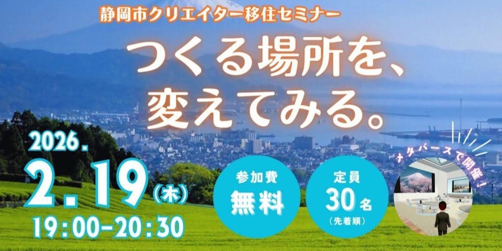 2026/02/13・メタバース空間 VirbelaGoで、静岡市へ移住したクリエイターから話が聞けるイベントです。 ・「静岡市ってどんなまち?」「クリエイター移住のリアル」など、セミナー形式でお話します。 ・フリートークの時間では、直接、登壇クリエイターに気軽に相談や質問ができます。 ・地方都市で、ワークライフバランスを大事にしつつ働きたい方に、おすすめのイベントです!