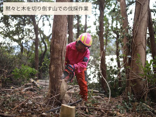 配属されたのは、新上五島町森林組合。週4日、男性職員と全く同じ作業をこなす日々。女性職員は森さん1人。森林組合の職員たちも、最初は女性隊員にどう接したらいいのか戸惑っていました。トイレなどの環境も女性に配慮された十分なものではありませんでしたが、それでも「女性だからできない」とは言われたくない一心で、チェーンソーの扱いから伐採技術まで習得していきました。もちろん、体力的な限界を感じる場面もありました。そんな時は正直に女性だからできないです、ではなくて、「この作業に時間がかかります」と伝え、職場も「怪我をしないことが一番」と彼女のペースを尊重してくれました。当初は戸惑いがあった職員たちも、彼女の誠実な姿勢を見て、気遣いを見せてくれる仲間へと変わっていきました。
