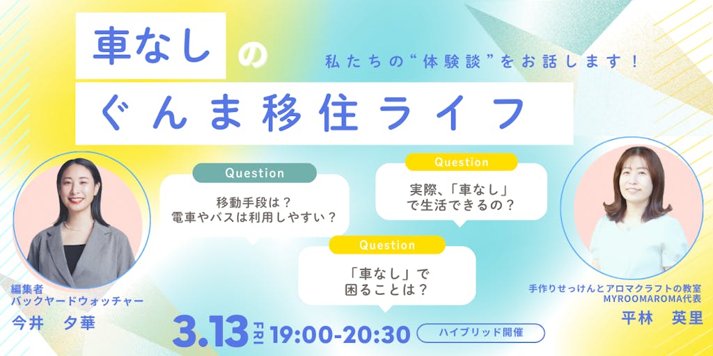 【3月13日|ハイブリッド開催】「車なし」の移住ライフ~私たちの“体験談”をお話します!
