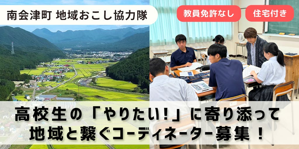南会津高校魅力化プロジェクトのコーディネーターとして、以下の業務を担います。 (1)放課後の居場所づくり・学習支援(サードプレイスの運営、学びの場づくり) (2)探究学習「南会津学」の企画・運営補助(地域人材と高校生のマッチング、授業サポート) (3)県外からの入学希望者へのサポート(説明対応、現地見学の受け入れ、入学後の生活支援) (4)高校の魅力化に資する業務全般(地域の応援サポーター組成、SNSでの情報発信、他地域との連携など) ※複数名の募集のため、適性や希望に応じて役割を調整します。