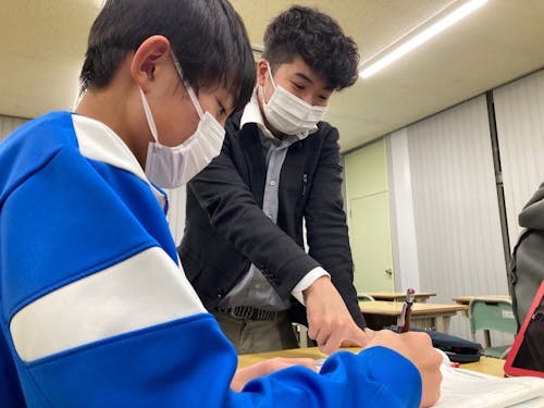 ①子どもたちへの声掛けと巡回 塾内を回り、ペンが止まっている子に「どうしたの?」「ここはこう考えてみようか」と声をかけたり。子どもたちが安心して学習に打ち込める雰囲気づくりがメインです。