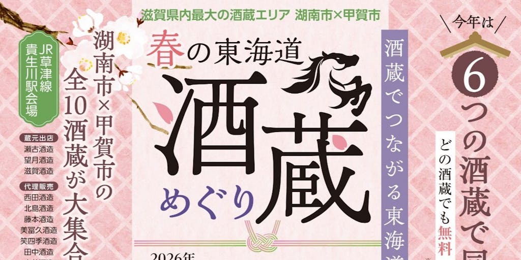2026/03/13滋賀県南部に位置する湖南市は、江戸時代には東海道五十三次の宿場町がおかれ、古くから交通の要衝として多くの人々が行き交ってきました。 今回は、湖南市と甲賀市にある6つの酒蔵で開催される蔵開きイベント「春の東海道酒蔵めぐり」をご紹介します🌸 お酒を楽しみながら、湖南市の魅力を知ってみませんか? 「日本酒大好き!」「歩きながらまちを巡ってみたい!」と思った方は、ぜひ「興味あるボタン」を押してくださいね🍶