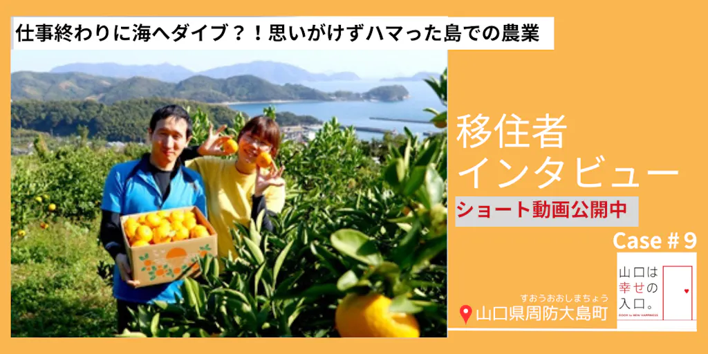 #Case9は大阪府出身の上妻あかねさんです。 農業高校で酪農を学んだのち、 農業バイトで全国を転々としていた時に 香川県のみかん園でご主人と出会いました。 ご主人についていく形で2014年に 周防大島町(すおうおおしまちょう)に移住し、 その後、独立して上妻みかん園を開業されました。
