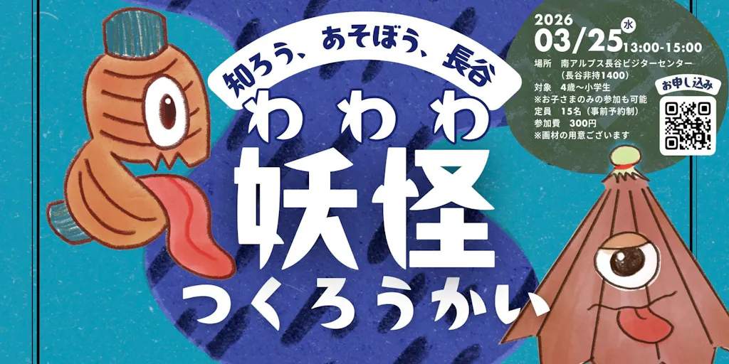 南アルプスに囲まれた 伊那市長谷地区。 山や湖に囲まれ「孝行猿」や「戸倉の大鷲」など 不思議な昔話が残る長谷には、今も妖怪が隠れているかもしれません。 長谷について楽しく学んで、オリジナルの妖怪を描いてみませんか?