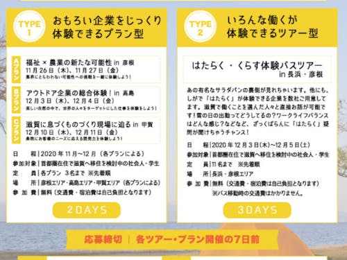 TYPE❷いろんな働くが体験できるツアー型 3DAYS ツアープラン:はたらく・くらす体験バスツアー in 長浜・彦根 2020年12月3日(木)と12月4日(金)と 12月5日(土) 詳細はこちら【 https://smout.jp/plans/2719 】