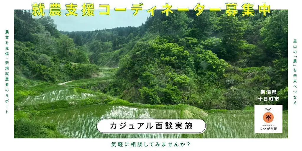 そこで、一般社団法人にいがた圏では、ミッション型地域おこし協力隊として新たに農業に従事する方を支援する「就農支援コーディネーター」を募集しています。 まちづくりを通して、十日町市の「農」の未来を創り出す方をお待ちしています!