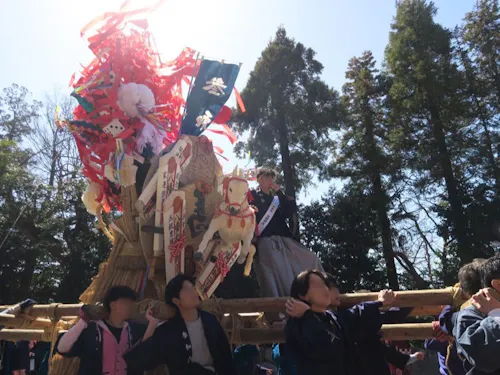 祭り当日、左義長は若衆たちに担がれ、「チョウヤレ、チョウヤレ」という威勢のよい掛け声とともに町を練り歩きます。 掛け声の「チョウヤレ」は「左義長さしあげ」の略で、「マッセ」は「左義長めしませ」という意味があります。