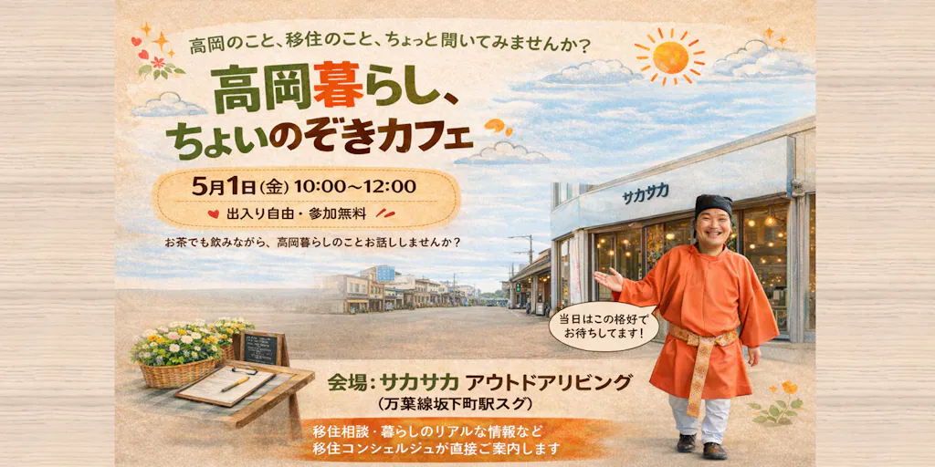観光で訪れた方も、移住を考え始めたばかりの方も、 それぞれのペースで関われる空間になっています。 ◎日 時:2026年5月1日(金)10:00〜12:00 ◎会 場:サカサカ アウトドアリビング(万葉線坂下町駅すぐ) ◎参加費:無料 ◎定 員:なし(出入り自由) ◎対 象:高岡に関心のある方(どなたでも歓迎)