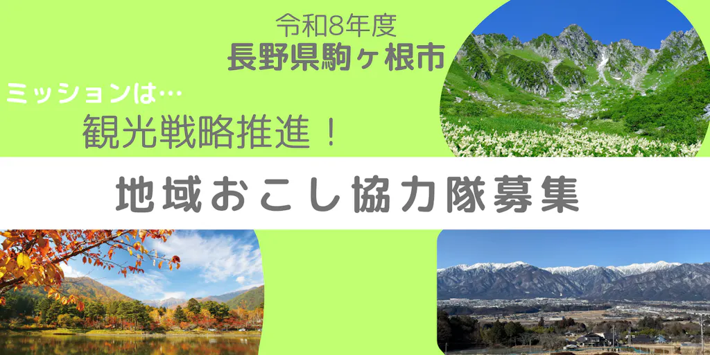 ■募集人員:1名 ■活動地域:駒ヶ根市全域(主に駒ヶ根高原) ■応募資格 ・年齢が25歳以上45歳以下の方(令和8年5月31日現在) ・3大都市圏をはじめとする都市地域に現に住所を所有し、委嘱後は生活の拠点を市内に移し、住民票を異動できる方。 その他、総務省「地域おこし協力隊推進要綱」による ※3大都市圏:埼玉県、千葉県、東京都、神奈川県、岐阜県、愛知県、三重県、京都府、大阪府、兵庫県、奈良県 ・地域おこしに意欲と熱意を有して積極的に企画・活動し、最長で3年間は継続して活動できる方 ・普通自動車運転免許証を有し、日常的に自動車の運転ができる方 ・携帯電話やパソコン、携帯情報端末等の情報通信機器を使用でき、ワード、エクセル、ソーシャルネットワーキングサービス等を活用できる方 ・地方公務員法(昭和25年法律第261号)第16条に規定する欠格条項に該当せず、心身ともに健康で誠実に業務を行うことができる方 ・委嘱期間終了後も駒ヶ根市において定住・就業・起業に意欲のある方