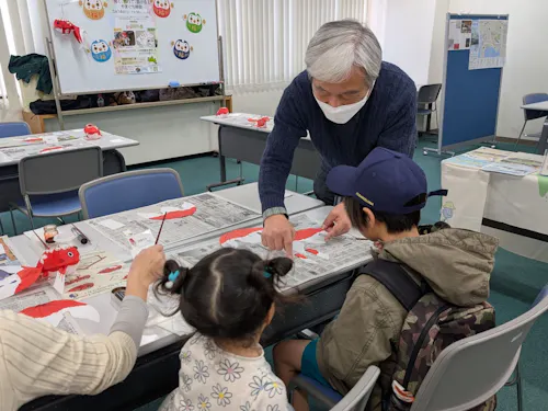 丁寧にわかりやすく教えてくださるので、小さいお子さんでも楽しく参加していただけます。 かわいい柳井金魚ちょうちんを自分の手で作れるとあって、親子での参加が多く自分だけの柳井金魚ちょうちんを夢中で作るお子さんたち。目の周りやうろこの模様など、筆を上手に使って描いたりと、キリっとかっこいい世界に一つだけの柳井金魚ちょうちんが次々と誕生していました!