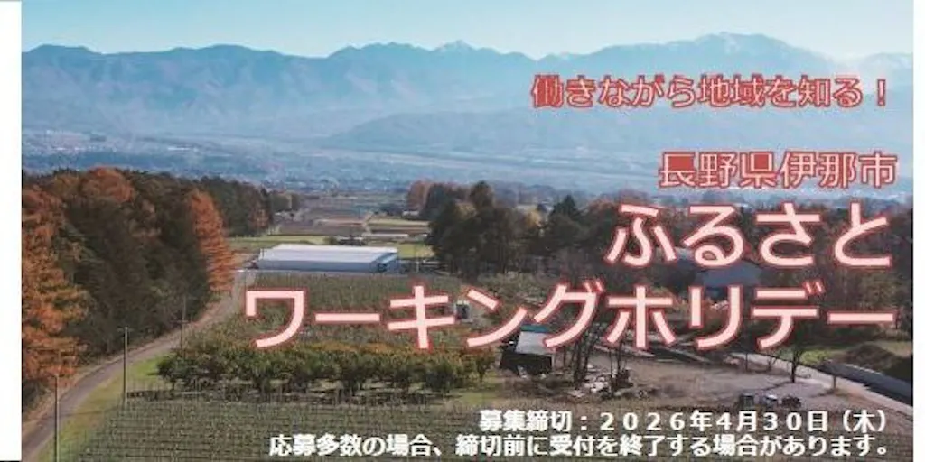 2026/04/16長野県伊那市で「仕事」と「暮らし」を体験できる、ふるさとワーキングホリデー。 伊那市の仕事とローカルライフを経験できる場づくりを行い、2週間~1か月、伊那市の仕事と暮らしを体験できます! 仕事をしながら、伊那市にいる間に、多くの人と出会っていただいたり、伊那の風土や魅力ある景観も楽しめます。