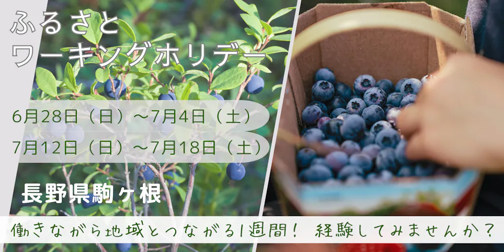 長野県駒ヶ根市で「仕事」と「暮らし」を体験できる、ふるさとワーキングホリデー。 仕事をしながら、多くの人と出会っていただき、駒ヶ根市の魅力を体験することができます。今回の仕事内容は、ブルーベリー収穫作業を中心とした農作業となります。 経験がない方でも丁寧な指導がありますので、安心してお申し込みください!